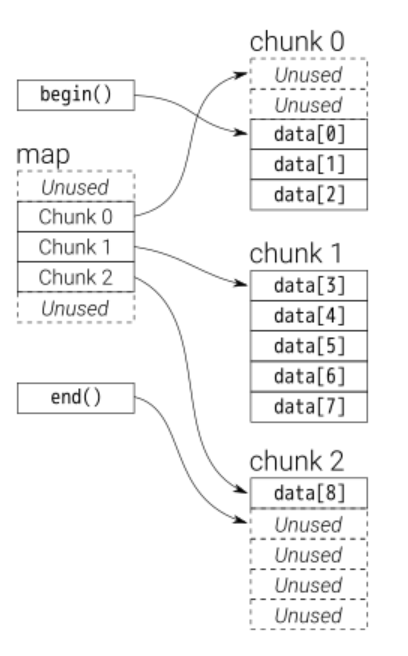 deque는 이러한 단점을 보완하기 위해 insert시 용량이 다 해도 공간을 늘리되 복사 작업을 하지 않는다.